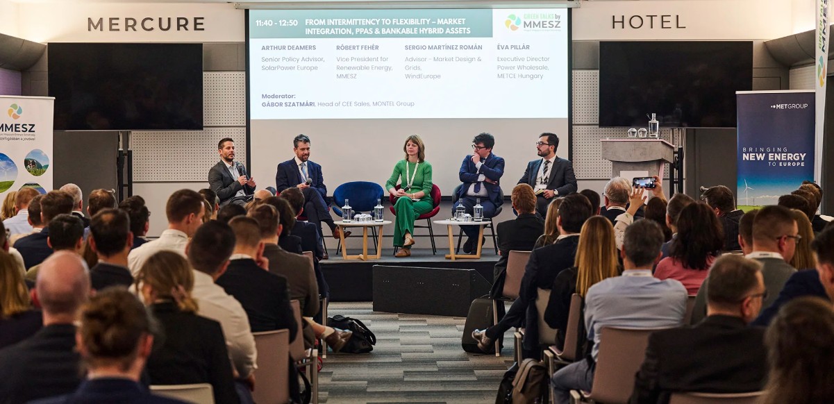 Az előadások mellett panelbeszélgetéseket is tartottak a konferencián. „Az időjárásfüggőségtől a rugalmasságig – beruházások a hibrid energiajövőbe” címet viselő panelben Pillár Éva energia-nagykereskedelmi ügyvezető igazgató (METCE Magyarország, MET Csoport), Arthur Daemers vezető szakpolitikai tanácsadó (SolarPower Europe), Fehér Róbert megújuló energetikáért felelős elnökhelyettes (MMESZ) és Sergio Martínez piac- és hálózattervezési szakértő (WindEurope) osztották meg véleményüket. Arthur Daemers azzal kezdte hozzászólását, hogy az EU napenergia-piaca tíz év után először mutat lassulást, növekedés van ugyan, de a növekedés dinamikája lassulóban.